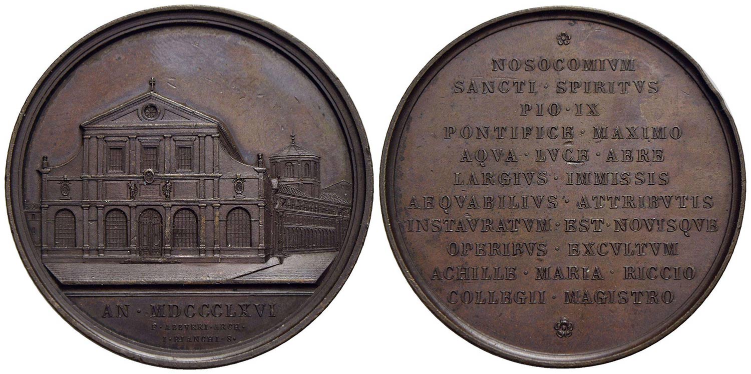 PAPALI - Pio IX (1846-1866) - Medaglia - 1866 - Ospedale di S. Spirito - Prospetto dell'ospedale - R/ Scritta Opus: Bianchi Ø: 44 mm. - (AE g. 35,9) RR Bart. XX-14