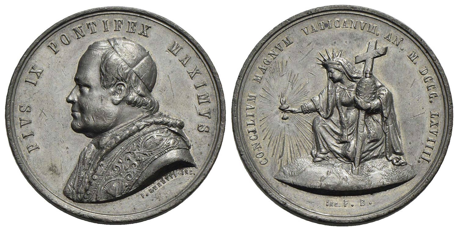 PAPALI - Pio IX (1866-1878) - Medaglia - 1869 - Concilio Ecumenico Vaticano - Busto a s. - R/ La Chiesa inginocchiata sul mondo Opus: F. Berutti Ø: 50 mm. - (MB g. 41,6) In scatola originale rotonda
