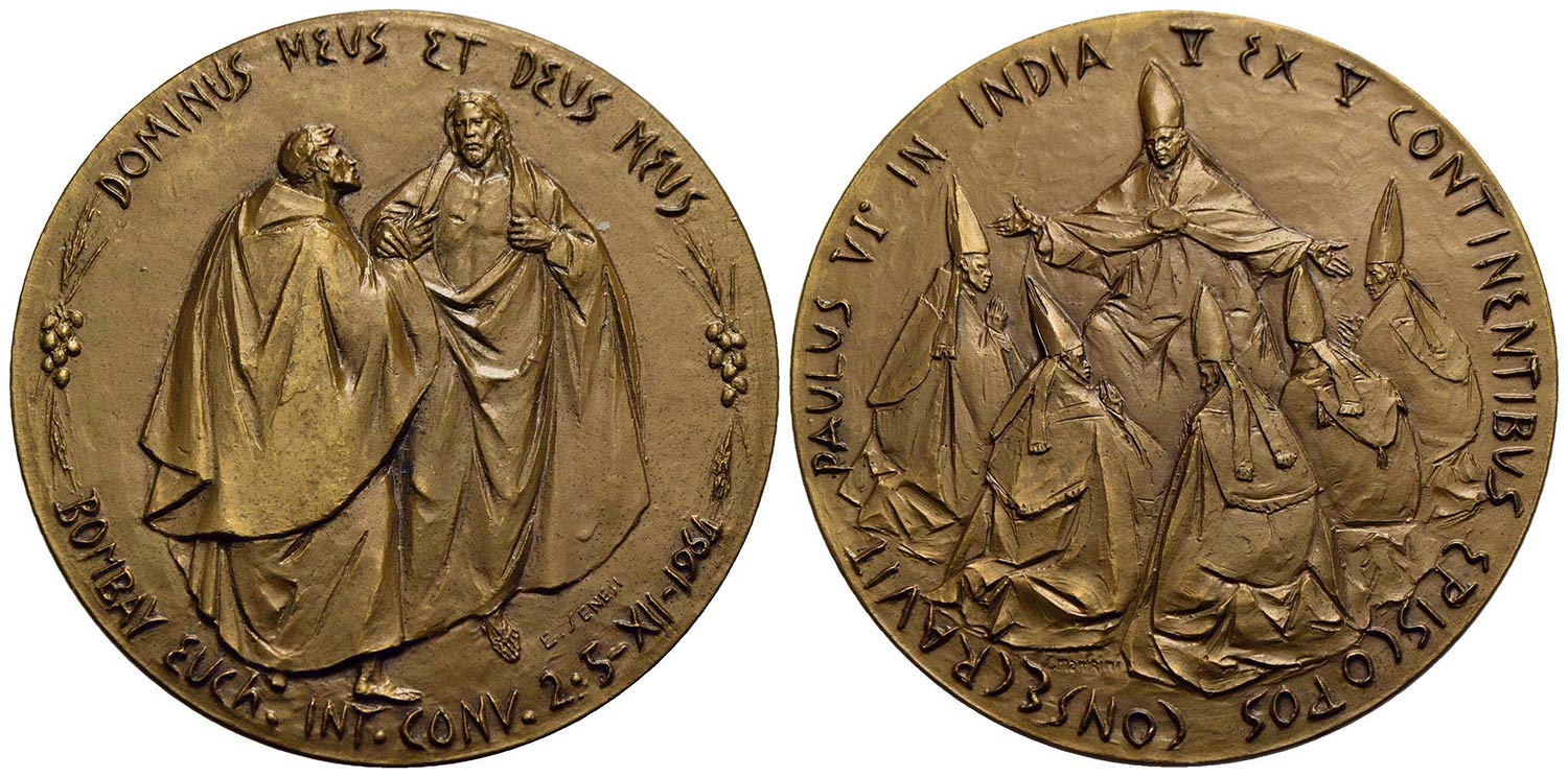 PAPALI - Paolo VI (1963-1978) - Medaglia - 1964 - Viaggio in India e il Congresso Eucaristico - Il Papa attorniato dai Vescovi di vari continenti - R/ Gesú Cristo mostra il costato a San Tommaso in piedi Opus: Manfrini Ø: 44 mm. - AE De Luca 371