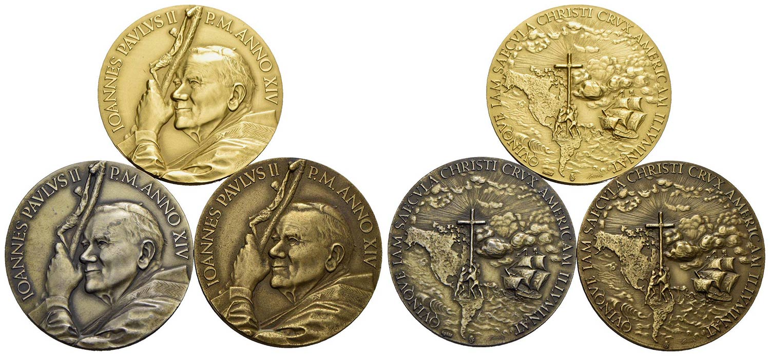 PAPALI - Giovanni Paolo II (1978-2005) - Medaglia - A. XIV - 1992 - V° Cent. Evangelizzazione Americhe - Busto a s. regge crocifisso astile - R/ Tre uomini innalzano la croce sul continente americano a d. una caravella Opus: Ferreira Ø: 44 mm. - (AU-AG-CU g. 54,3)Medaglia annuale coniata in AU 917 in 900 esemplari, quelle in Ag e CU in 6.000 esemplari Trittico in scatola di pelle bianca originale IPZS, con stemma pontificio dorato e con certificato di autenticità, sul bordo n. 315/900 - La scatola di cartoncino bianco esterno è macchiata - Ottimo insieme
