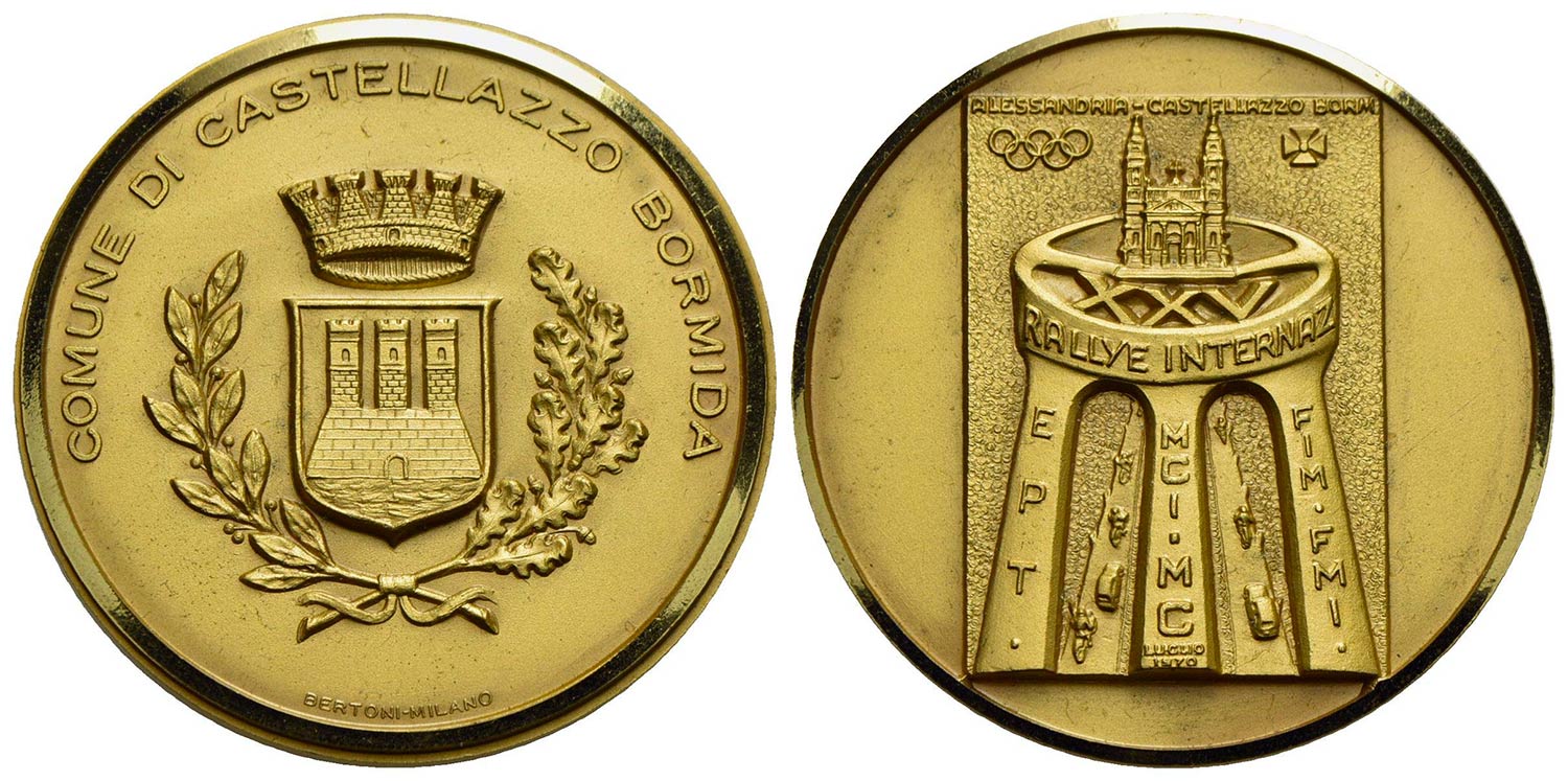CITTA' - Castellazzo Bormida - Medaglia - Rallye Alessandria - Castellazzo Bormida - Stemma del comune tra rami di alloro e quercia - R/ XXV Rallye Internazionale Opus: Bertoni - Milano Ø: 43 mm. - AE dorato In scatola originale