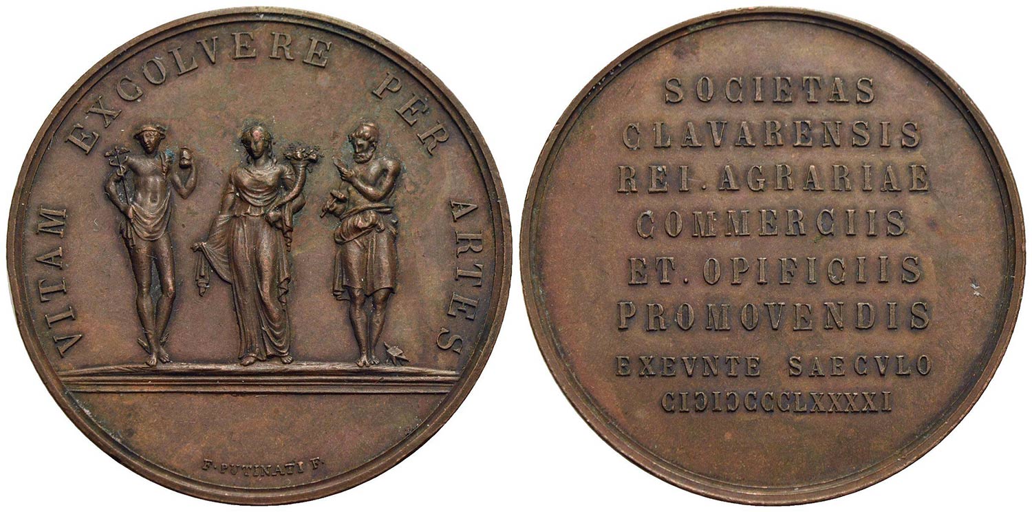 CITTA' - Chiavari - Medaglia - 1891 - Società agraria e dei commerci - Figure allegoriche di Mercurio, Pomona e Vulcano - R/ Scritta Opus: Putinati Ø: 46 mm. - (AE g. 55,2) R Martini 3447
