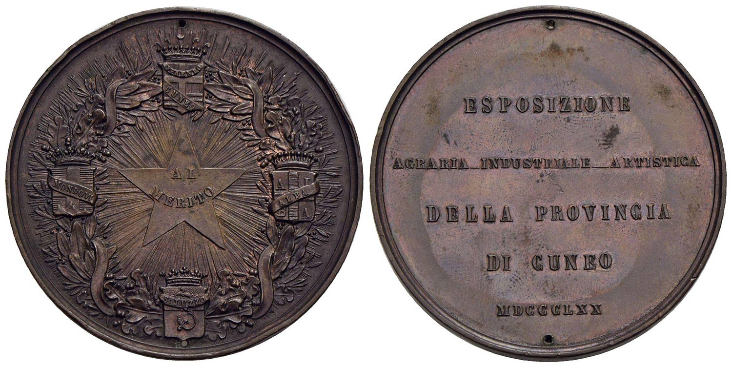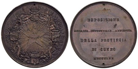 CITTA' - Cuneo - Medaglia - 1870 - Esposizione Agricola Industriale - Stemmi e stella - R/ Scritta Ø: 50 mm. - (AE g. 48,4) Forata
