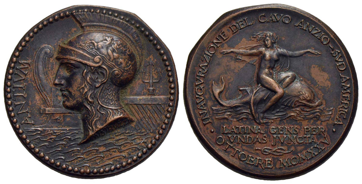 FASCISTE - Medaglia - 1925 A. III - Inaugurazione del cavo Anzio - Sud America - Testa elmata di Minerva a s. - R/ Donna a braccia aperte Opus: Mistruzzi Ø: 37 mm. - (AE g. 30,5) R Cas. III/17