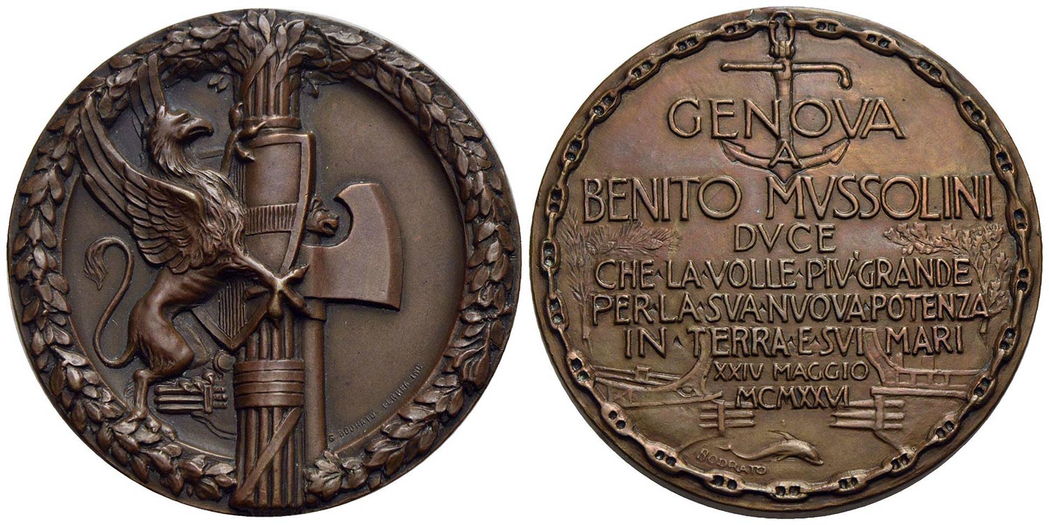 FASCISTE - Medaglia - 1926 A. IV - Visita del Duce a Genova - Grifone a d. con fascio - R/ Scritta Opus: Bodrato Ø: 61 mm. - (AE g. 100,6) R Cas. IV/11 var.