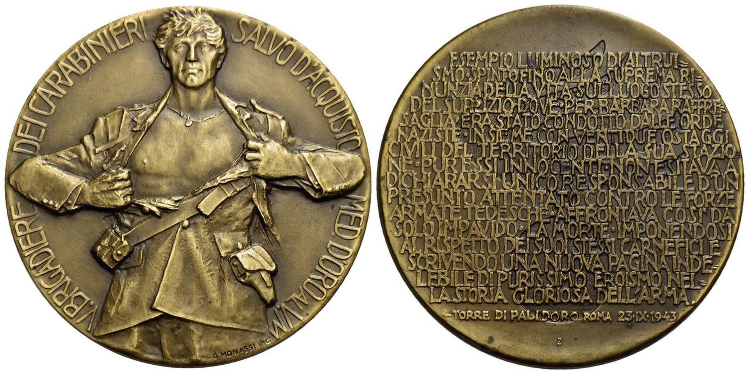 VARIE - Medaglia - CARABINIERI - Vicebrig. Salvo D'Acquisto - Medaglia d'oro al V. M. 1943 - Carabiniere che mostra il torace - R/ Descrizione dell'atto eroico Opus: G. Monassi Ø: 60 mm. - AE In scatola originale