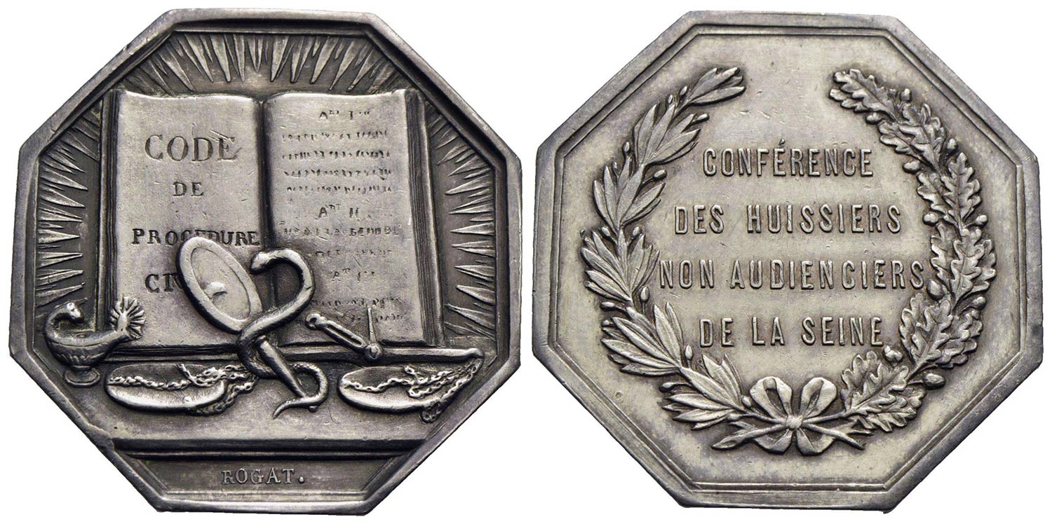 FRANCIA - Medaglia - Conferenza degli ufficiali non giudiziari della Senna - Codice di procedura civile aperto - R/ Scritta tra rami di quercia e alloro Ø: 35 mm. - (AG g. 16,2) Esagonale - Sul bordo ARGENT
