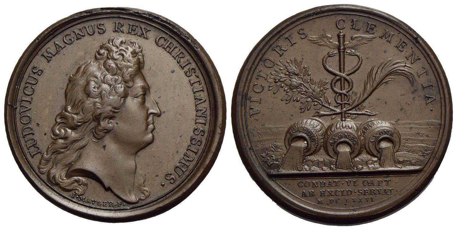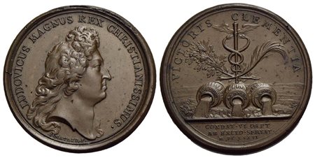 FRANCIA - Luigi XIV (1643-1715) - Medaglia - 1676 - Testa a d. - R/ Sotto un caduceo scorrono tre urne che rappresentano i fiumi Escaut, Haine e Hosnau Opus: Mauger Ø: 41 mm. - (AE g. 35,8) Divo 153