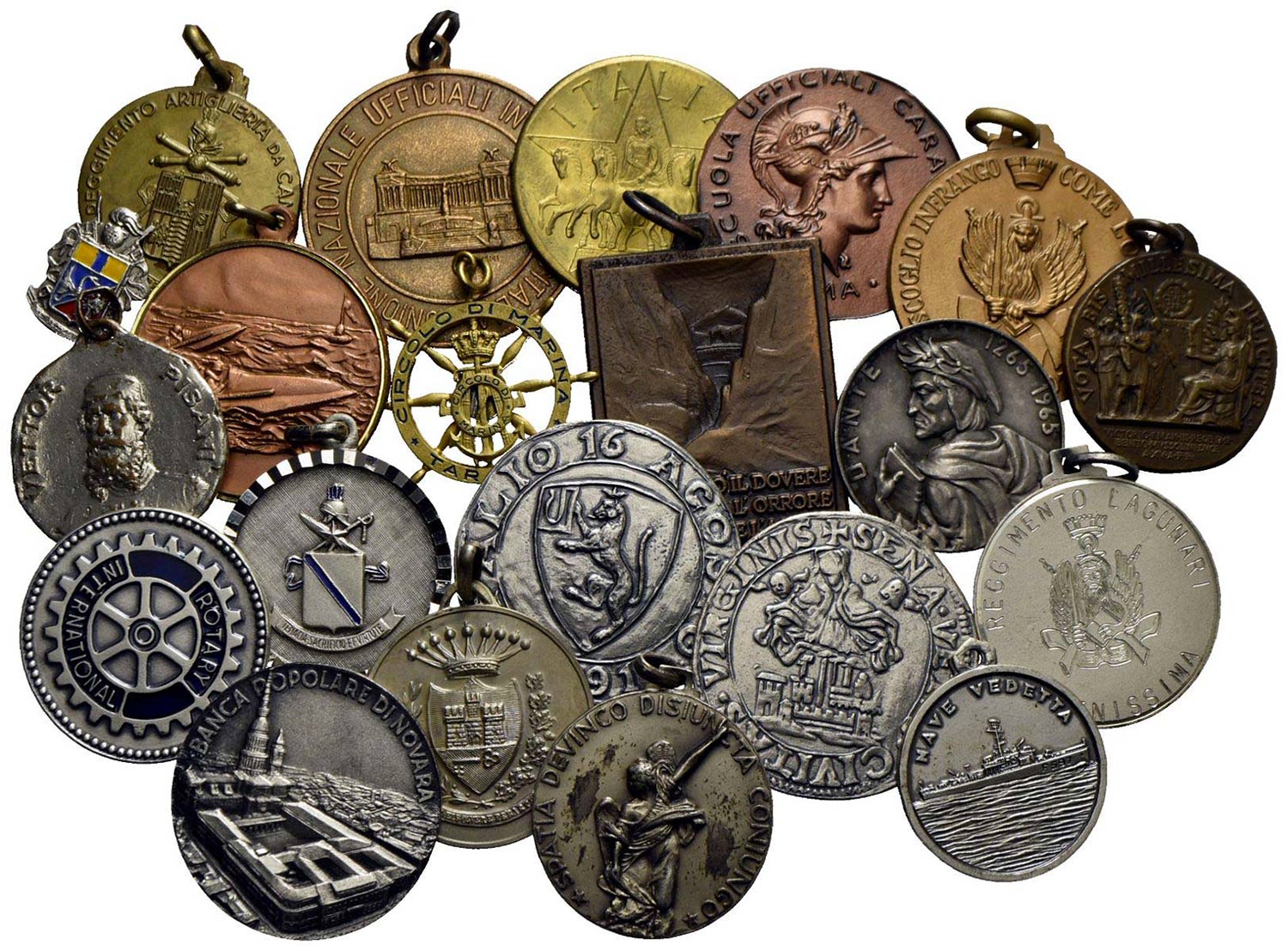 Medaglie - Medaglie di vari metalli (9 in Ag, gr 80) a tema militare, sportivo e culturale - Lotto di 21 medaglie