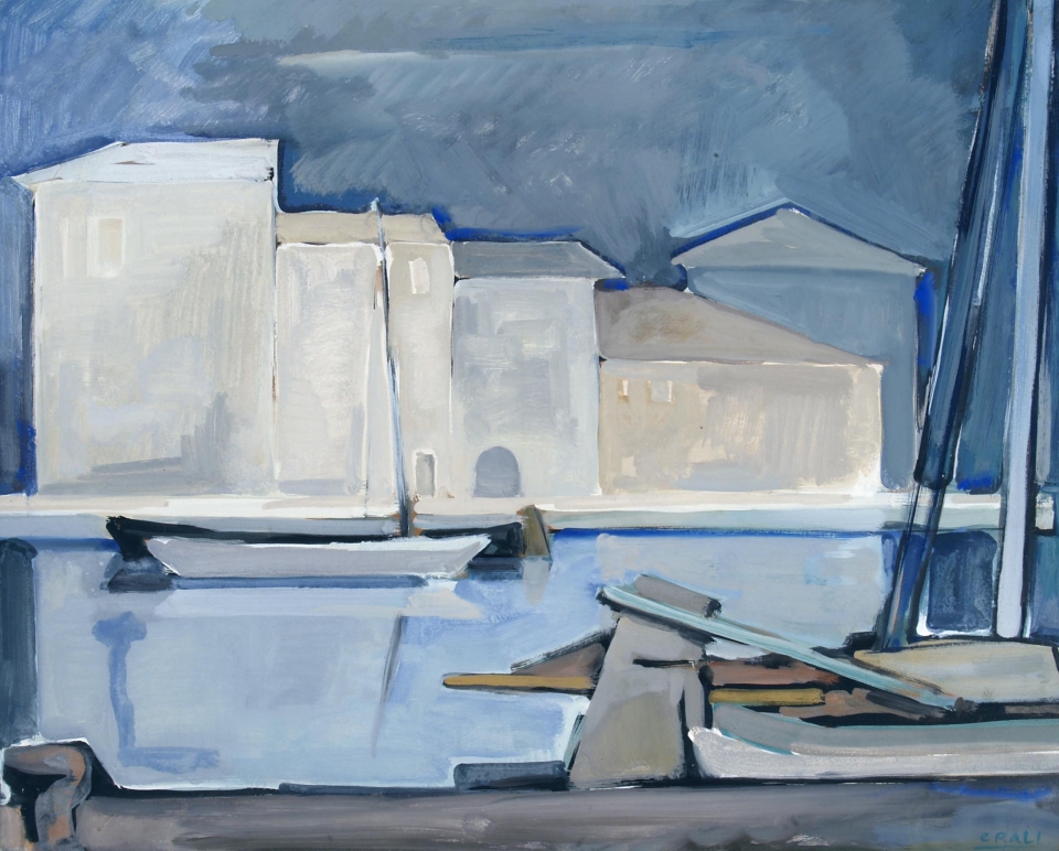 "Barche sul canale" anni '50 Tempera su cartoncino cm. H: 46.00 L: 57.00 Firma in basso a destra. Al retro timbri: Galleria Bergamini (Mi), Crali. Verbale di perizia su foto rilasciato dalla Galleria Pace a firma di Gimmi Stefanini, perito d'arte del Tribunale di Milano e della Procura della Repubblica Svizzera, Lugano.