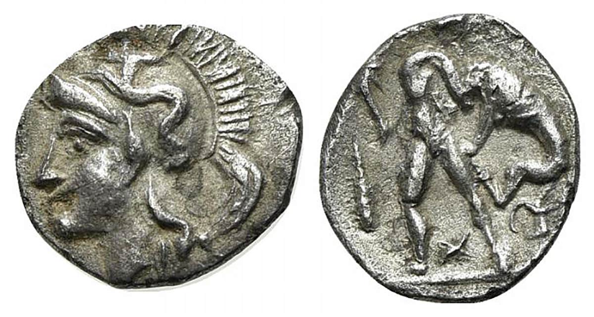 Southern Apulia, Tarentum, Diobol, ca. 380-325 BC. AR (g 0,87; mm 10; h 9). Head of Athena l., wearing crested Attic helmet decorated with Skylla scanning; Rv. Herakles strangling the Nemean Lion; club to l.; X between legs. Cf. V