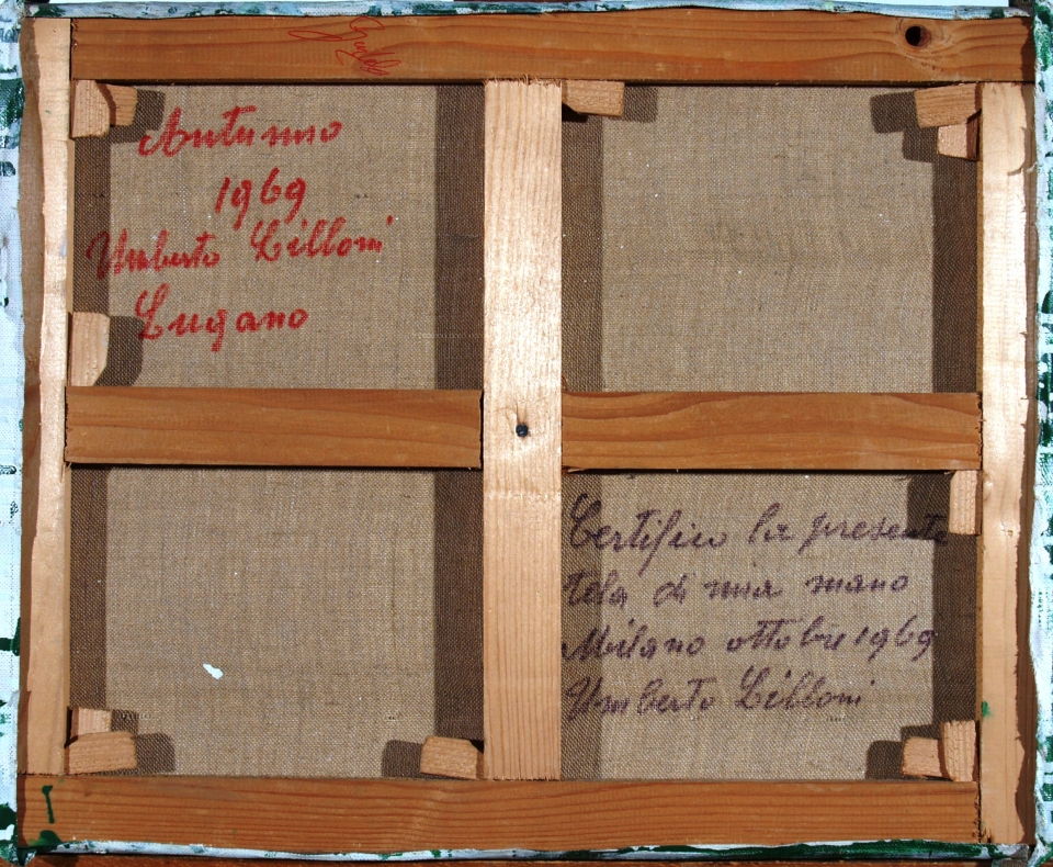 Firma in basso a sinistra. Al retro: anno e firma. A tergo dell'opera scritte in rosso: Autunno 1969, Umberto Lilloni, Lugano. In nero: Certifico la presente tela di mia mano, ottobre 1969, Umberto Lilloni. Verbale di perizia su foto rilasciato dalla Galleria Pace a firma di Gimmi Stefanini, perito d'arte del Tribunale di Milano e della Procura della Repubblica Svizzera, Lugano.