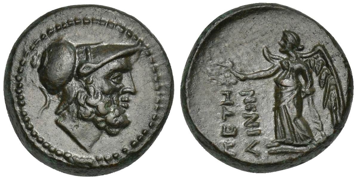 Bruttium, Petelia, late 3rd century BC; AE (g 3,74; mm 16; h 10); Helmeted head of Ares r. Ev. ΠETHΛINΩN, Nike standing l., holding wreath. HNItaly 2456; SNG ANS 607. Extremely fine