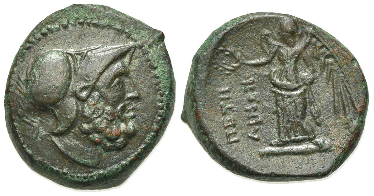 Bruttium, Petelia, late 3rd century BC; AE (g 4.95; mm 16; h 1); Helmeted head of Ares r. Ev. ΠETHΛINΩN, Nike standing l., holding wreath. HNItaly 2456; SNG ANS 607. Extremely fine