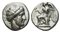 Bruttium, Terina, Stater, ca. 420-400 BC; AR (g 7,04; mm 18,5; h 6). Head of the nymph Terina r.; Rv. Nike seated l. on plinth, holding out r. hand upon which a small bird alights, l. hand resting on plinth. HNItaly 2617. Very fine