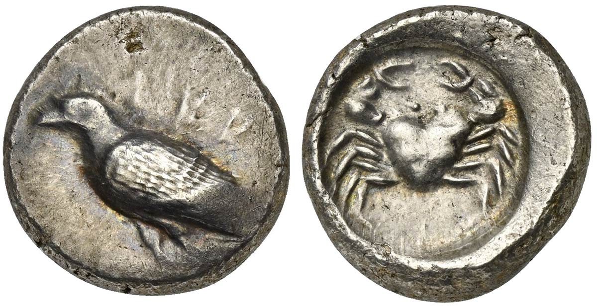 Sicily, Akragas, Didrachm, ca. 495-485 BC. AR (g 8,83; mm 21; h 5). AKRA, eagle standing l., Rv. crab within incuse circle. Westermark, Coinage, Period I, Group II, 102.1 (O43/R63) (same dies). Cabinet tone, struck with worn obver