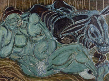 Firma ed anno in basso a sinistra. Autentica dell'autore su foto. Catalogo Generale G. Migneco, rep. 2023, Bonaparte (Mi). Etichetta al retro: Galleria del Naviglio (Mi).