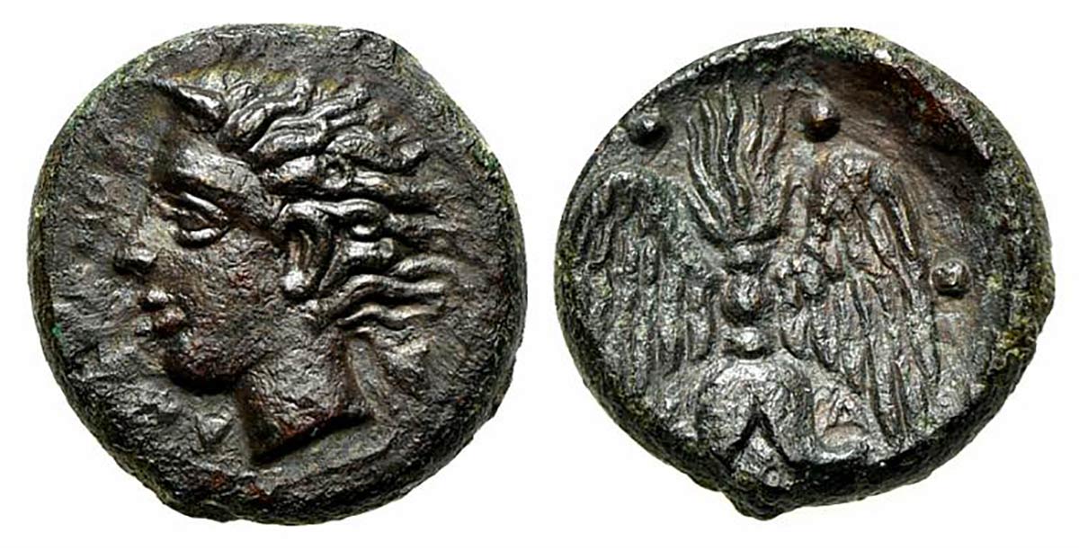 Sicily, Katane, Tetras or Trionkion, ca. 415/3-403/2 BC. AE (g 2,22; mm 12; h 4). AMENANOΣ, Horned head of Amenanos l.; Rv. K - A, Winged thunderbolt; three pellets around. CNS 1; HGC 2, 607. Good very fine
