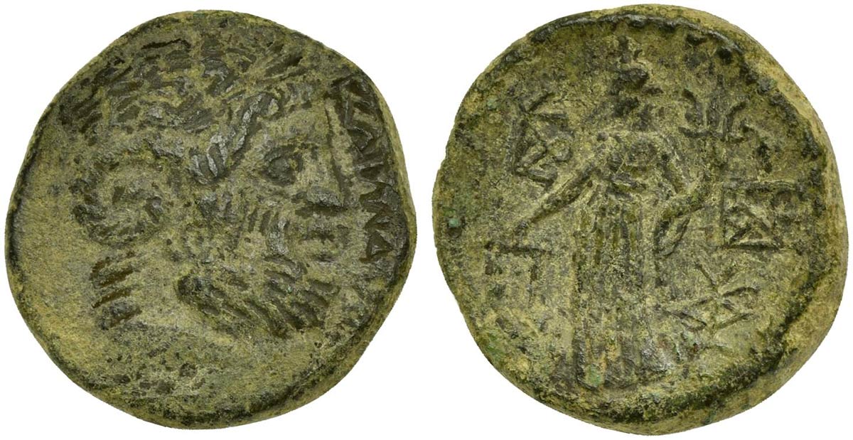Sicily, Katane, Bronze, 2nd-1st century BC. AE (g 8,67; mm 20; h 12). ΚΑΤΑΝΑΙΩΝ, laureate head of Zeus Ammon r., Rv. Aequitas standing l., holding scales and cornucopiae; on l., monogram; on r., two monograms. CNS 17; SNG ANS 1298