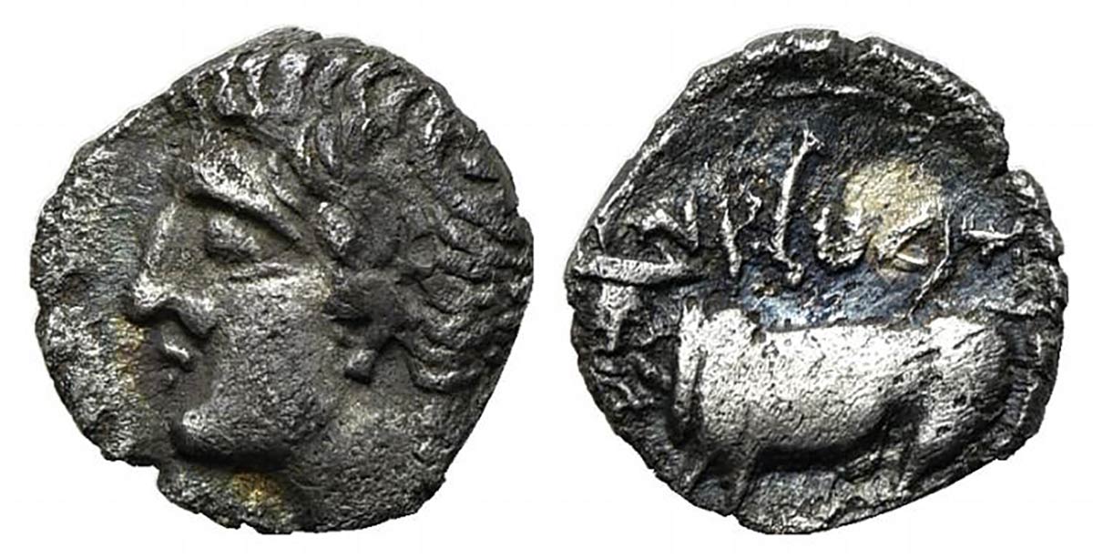 Sicily, Panormos as Ziz, Litra, ca. 405-380 BC; AR (g 0,41; mm 8,5; h 3); Male head l.; Rv. Man-headed bull standing l. ; SNG ANS -; HGC 2, 1047. Near very fine