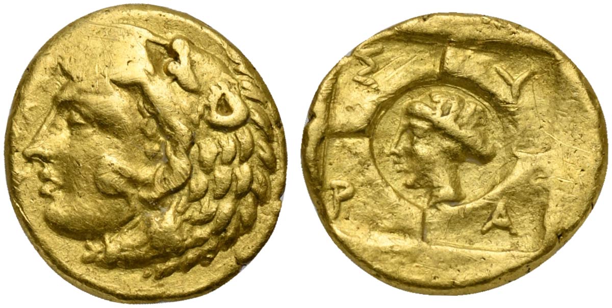 Sicily, Syracuse, Dionysios I (405-367 BC); AV 20 Litrai – Tetradrachm (g 1,17; mm 10; h 10); Head of Herakles l., wearing lion skin; [ΣY-PA] to l. Rv. Quadripartite incuse square, Σ-Y-P-A in quarters; in deeper incuse circle in c
