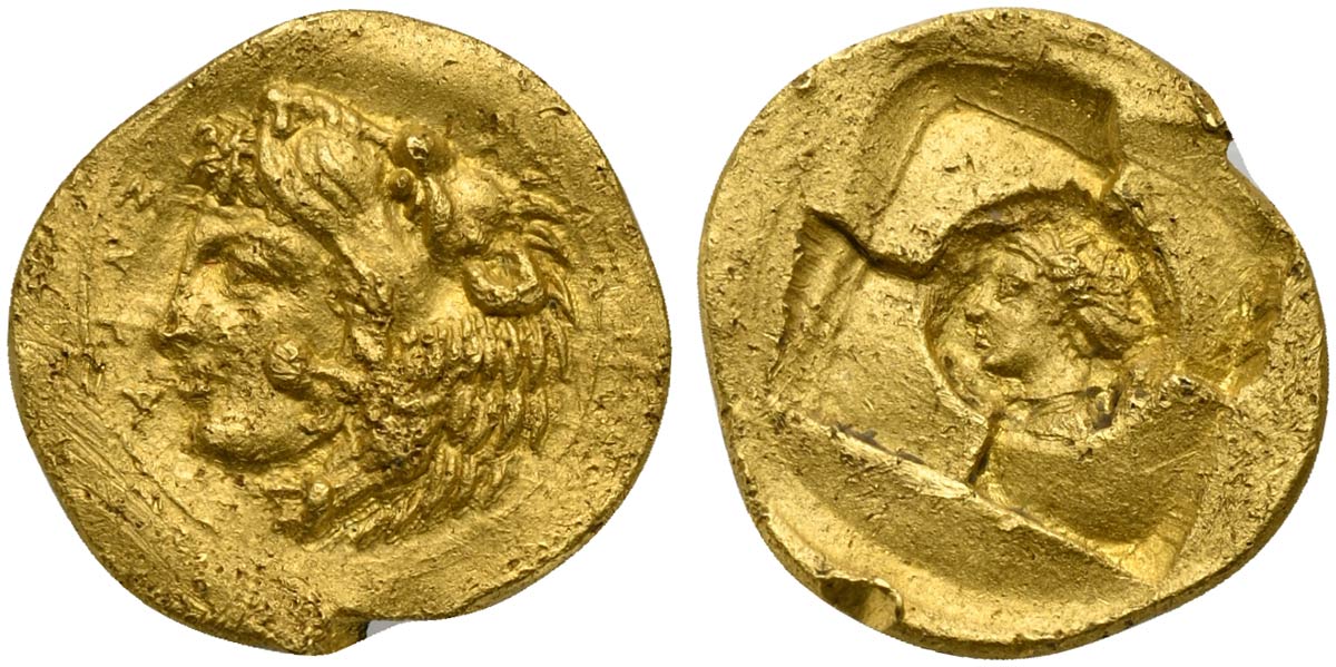 Sicily, Syracuse, 20 Litrai struck under Dionysios I, ca. 405-367 BC. AV (g 1,15; mm 12; h 3). ΣYPA, head of Herakles l., wearing lion skin, Rv.Quadripartite incuse square, Σ-Y-P-A in quarters; in deeper incuse circle in center, small female head (Arethousa?) l. Bérend pl. XI, 3; Boehringer, Münzprägungen, pl. I, 6; HGC 2, 1289. Good very fine