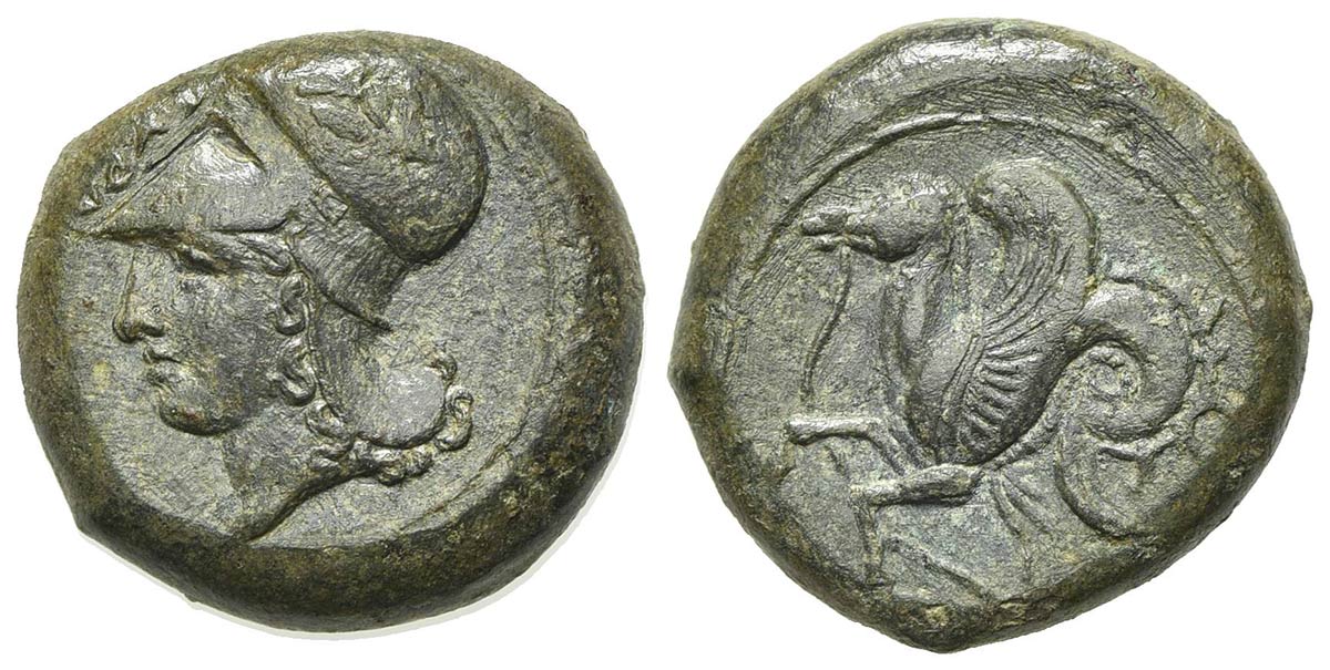 Sicily, Syracuse, Hemilitron, 400-390 BC. AE (g 7,50; mm 19; h 9). ΣYΡΑ, Head of Athena l., wearing Corinthian helmet decorated with wreath; Rv. Hippocamp l. CNS 41; SNG ANS 434-46; HGC 2, 1456. Good very fine