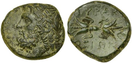Sicily, Syracuse, Bronze struck under the Fourth Democracy, ca. 289-287 BC. AE (g 7,15; mm 22; h 4). ΔΙΟΣ ΕΛΕΥΘΕΡΙΟΥ, laureate head of Zeus Eleutherios l.; behind, Δ, Rv. ΣYPAK / OΣIΩN, winged thunderbolt. CNS 148; BAR issue 35; Favorito type 33a; SNG ANS -. Very rare. Green patina and extremely fine.