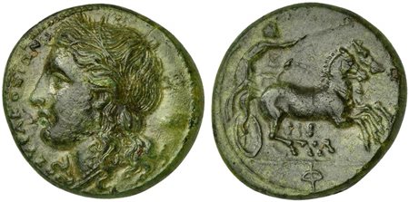 Sicily, Syracuse, Litra struck under Hiketas, ca. 288-279 BC. AE (g 6,57; mm 20; h 6). ΣYPAKOΣIΩN, wreathed head of Kore l.; behind, astragalus. Rv. Charioteer driving fast biga r., holding kentron and reins; in ex. Φ. CNS 124 Ds1