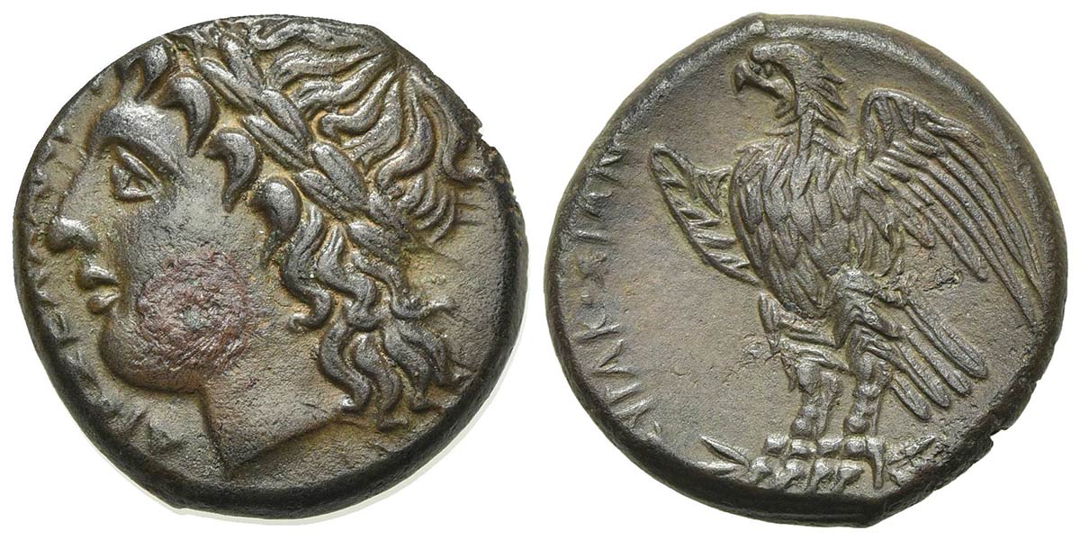 Sicily, Syracuse, Litra struck under Hiketas, ca. 288-279 BC. AE (g 7,80; mm 21; h 6). ΔIOΣ EΛΛANIOY, laureate head of young Zeus Hellanios l., Rv. ΣYPAK - OΣIΩN, eagle standing l. on thunderbolt. CNS 154; SNG ANS 782-3; HGC 2, 1448. About extremely fine