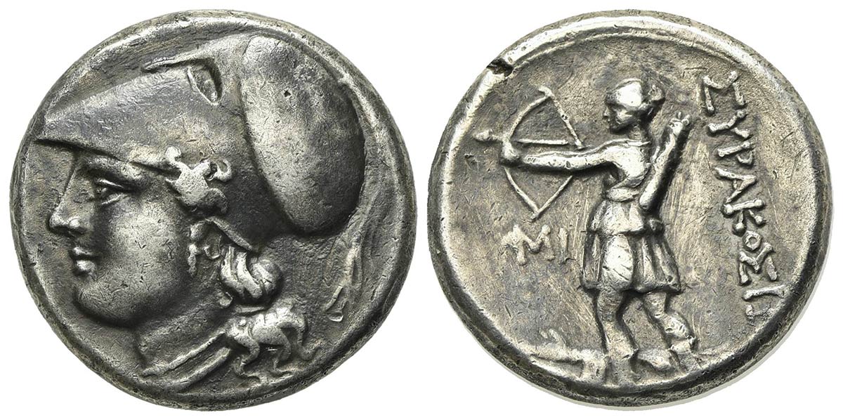Sicily, Syracuse, 12 Litrai struck under the Fifth Democracy, ca. 214-212 BC. AR (g 9,93; mm 21,5; h 6). Helmeted head of Athena l.; Rv. ΣYPAKOΣI[ΩN], Artemis standing l., drawing bow; below, hound springing l.; MI to l. HGC 2, 1412; SNG Copenhagen 877. Very fine