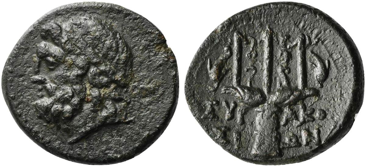 Sicily, Syracuse, Bronze struck under the Fifth Democracy, ca. 214-212 BC. AE (g 2,23; mm 15; h 6). Diademed head of Poseidon l.; behind, uncertain symbol. Rv. ΣΥΡ - ΑΚΟ / ΣΙ - ΩΝ, ornate trident; on both side, dolphin. CNS 208; H