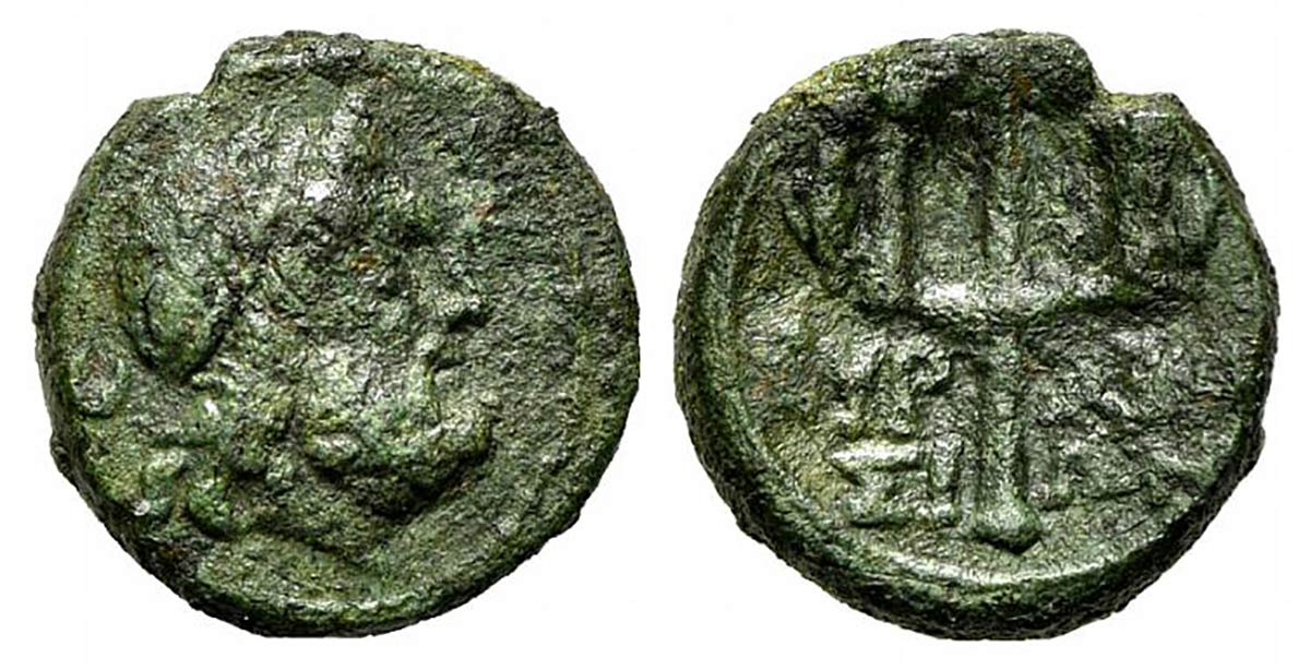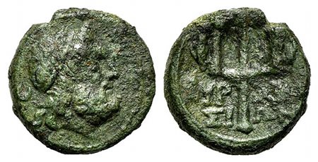 Sicily, Syracuse, Bronze, ca. 214-200 BC. Æ (12mm, 2.21g, 12h). Diademed head of Poseidon r.; Rv. ΣΥΡ - ΑΚΟ / ΣΙ - ΩΝ, Ornamented trident head. CNS 209; HGC 2, 1526. Rare, Good Fine