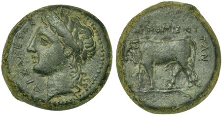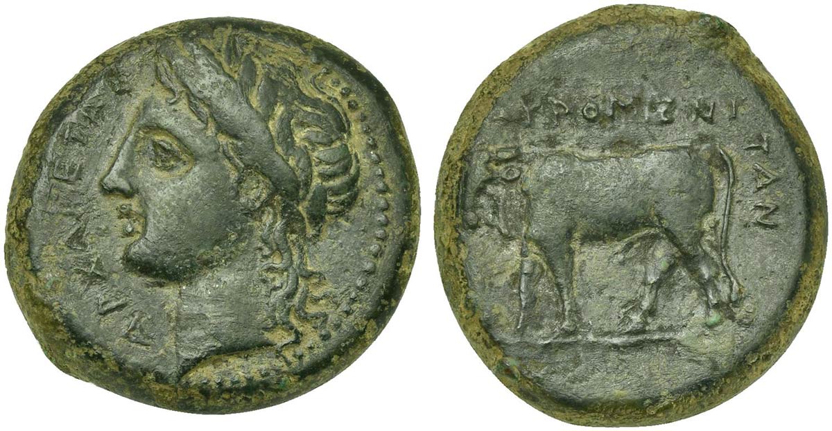 Sicily, Tauromenion, Hemidrachm, after 357 BC. AE (g 12, 22; mm 24; h 3). ΑΡΧΑΓΕΤΑΣ, laureate head of Apollo r., Rv. ΤΑΥΡΟΜΕΝΙΤΑΝ, men-headed bull walking l. CNS 1/8; SNG München 1519; Virzi pl. LXIX n. 1997. Rare. Dark green patina and extremely fine.