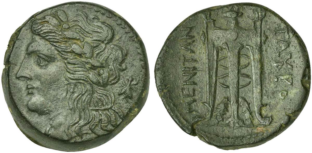Sicily, Tauromenion, Bronze, ca. 207-190 BC. AE (g 13,06; mm 24; h 7). Laureate head of Apollo l.; behind, bee, Rv. ΤΑΥΡΟ - ΜΕΝΙΤΑΝ, tripod. CNS 25; HGC 1582. Rare. Untouched patina, extremely fine.