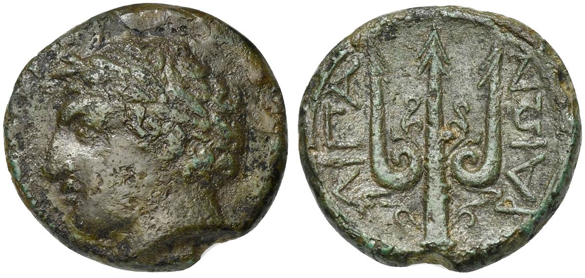 Islands of Sicily, Lipara, ca. 304-252 BC; AE Unit (g 6,71; mm 21; h 1); Laureate head of Apollo l.; Rv. ΛIΠAPAIΩN, Ornamented trident head. CNS 28; SNG ANS -; HGC 2, 1781. Rare, near very fine