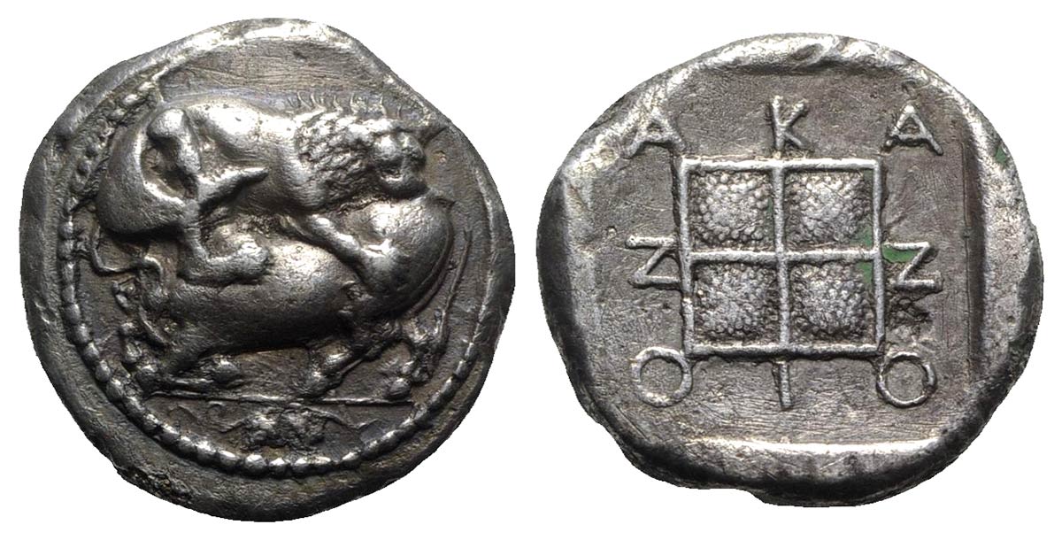 Macedon, Akanthos, Tetradrachm, ca. 430-390 BC; AR (g 14.01; mm 23; h 5). Lion, r., attacking bull kneeling to l.; Rv. AKANΘION, Ethnic on raised frame around quadripartite square. Desneux 117. Good very fine - near extremely fine