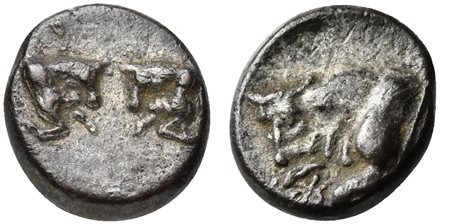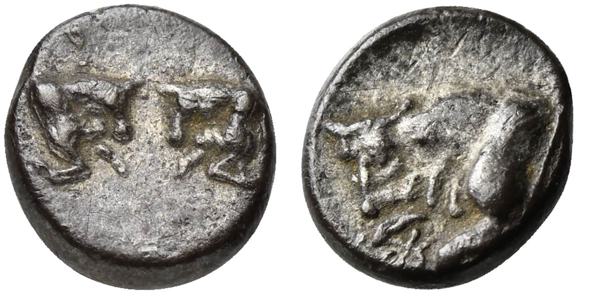 Caria, Uncertain, Hemiobol, ca. 500-450 BC; AR (g 0,25; mm 7; h 12); Confronted foreparts of two bulls; Rv. Forepart of bull l. SNG Keckman 912; SNG Kayhan 968-70. Good very fine