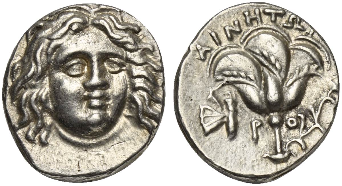 Islands of Caria, Rhodos, Rhodes, Drachm, ca. 205-190 BC; AR (g 2,79; mm 15; h 11); Ainetor, magistrate; Head of Helios facing slightly r. Rv. R-O, Rose with bud to r.; AINHTΩ[P] above, butterfly to left. Ashton 282; SNG Keckman 587; HGC 6, 1453. Extremely fine
