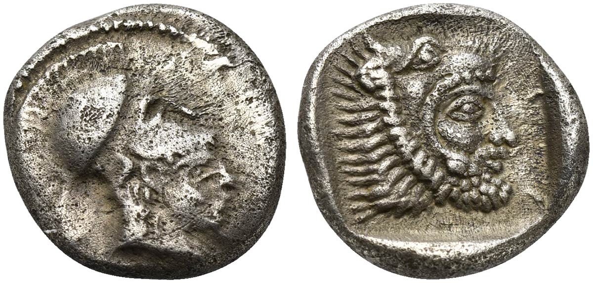 Kings of Lycia, Erbbina (ca. 390-380 BC); AR 1/6 Stater (g 1,49; mm 12; h 3); Head of Athena r., wearing Corinthian helmet decorated with palmette; Rv. Bearded head of Herakles r. within incuse square. Traité II 383. Very fine