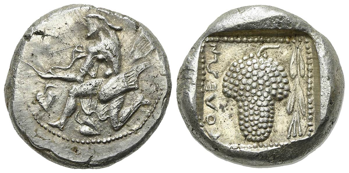Cilicia, Soloi, Stater, ca. 440-410 BC. AR (g 11.14; mm 21; h 1). Amazon kneeling l., quiver and bowcase at her side, holding bow; ivy leaf to l.; Rv. ΣOΛEΩN, Grape bunch; laurel branch to r.; all within incuse square. Casabonne Type 1; SNG BnF –; cf. SNG Levante 37. Good very fine