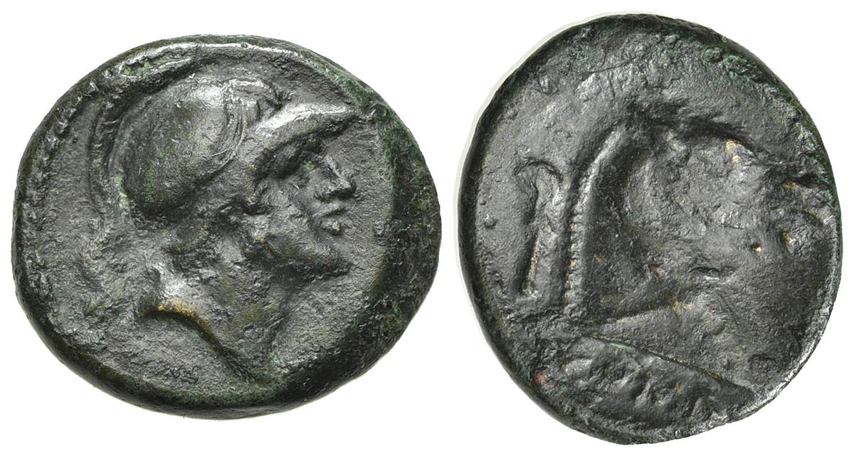 Anonymous, Rome, ca. 241-235 BC. AE (g 3,15; mm 16,5; h 9). Helmeted head of Mars r.; Rv. Horse head r.; sickle behind; ROMA below. Crawford 25/3; HNItaly 299; Sydenham 26. About very fine