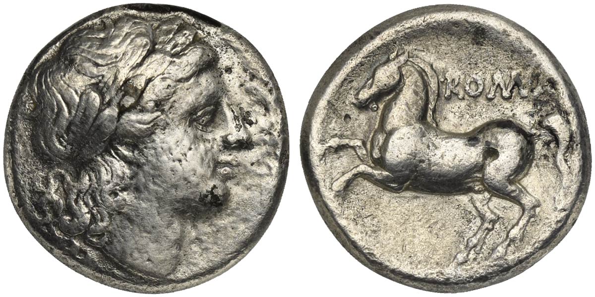 Lot 585 | Anonymous, Didrachm, Rome, ca. 235 BC. AR (g 6,46; mm 19; h 6). Laureate head of Apollo r., Rv. Horse rearing l.; ROMA above. Crawford 26/1; RSC 37; Sydenham 27. Very fine