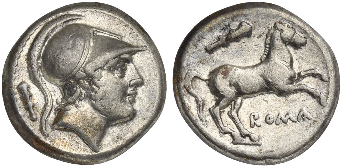Anonymous, Didrachm, Rome, ca. 235 BC. AR (g 6,59; mm 19; h 6). Helmeted head of Mars r.; club behind, Rv. Horse galloping r.; club above, ROMA below. Crawford 27/1; RSC 32; Sydenham 23. Very fine - good very fine