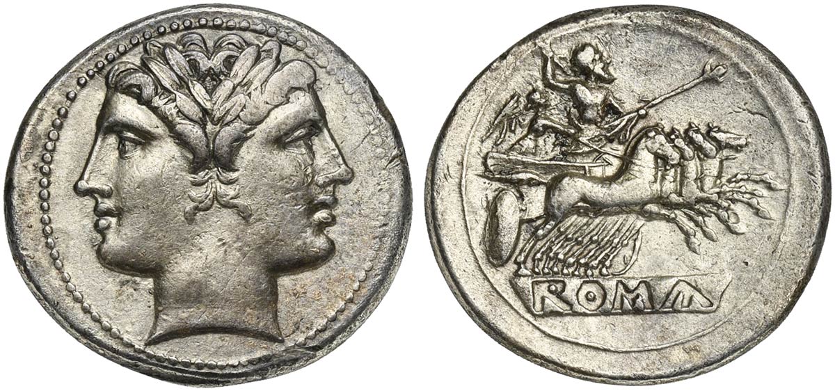 Lot 589 | Anonymous, Didrachm - Quadrigatus, Rome, ca. 225-212 BC. AR (g 6,65; mm 24; h 6). Laureate head of Janus, Rv. Jupiter, holding sceptre and thunderbolt, in quadriga r. driven by Victory; incuse ROMA in raised tablet below. Crawford