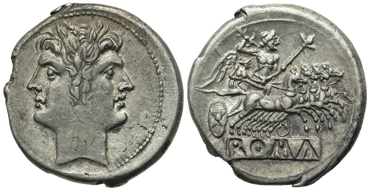 Anonymous, Didrachm - Quadrigatus, Rome, ca. 225-212 BC. AR (g 6,74; mm 22.5; h 6). Laureate head of Janus, Rv. Jupiter, holding sceptre and thunderbolt, in quadriga r. driven by Victory; incuse ROMA in raised tablet below. Crawfo