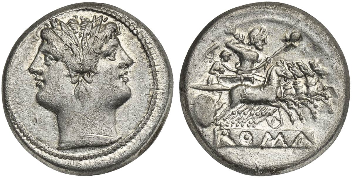 Anonymous, Didrachm - Quadrigatus, Rome, ca. 225-212 BC. AR (g 6,21; mm 21; h 5). Laureate head of Janus, Rv. Jupiter, holding sceptre and thunderbolt, in quadriga r. driven by Victory; incuse ROMA in raised tablet below. Crawford