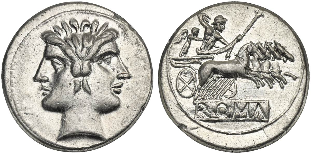 Anonymous, Didrachm - Quadrigatus, Rome, ca. 225-212 BC. AR (g 6,71; mm 23; h 1). Laureate head of Janus, Rv. Jupiter, holding sceptre and thunderbolt, in quadriga r. driven by Victory; incuse ROMA in raised tablet below. Crawford