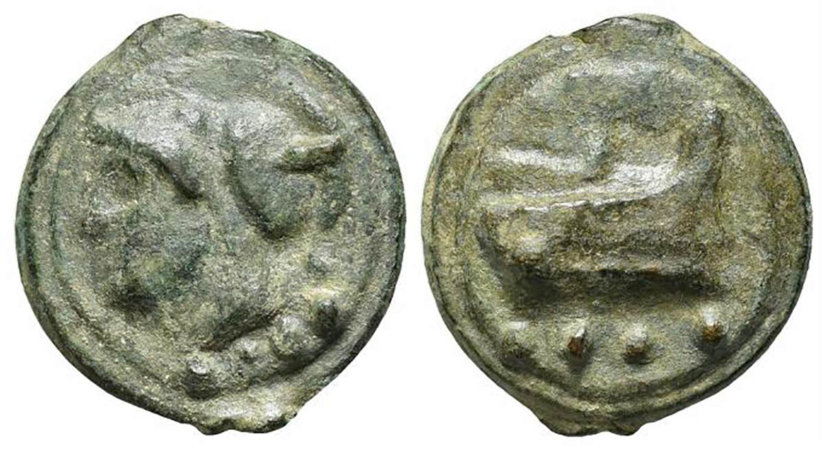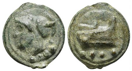 Anonymous, Rome, Cast Triens, ca. 225-217 BC. AE (g 71,61; mm 42; h 12). Helmeted head of Minerva or Mars l. on a raised disk; Rv. Prow of galley r. on a raised disk. Crawford 35/3a; Vecchi, ICC, 78; HNItaly 339; RBW 87. Near very