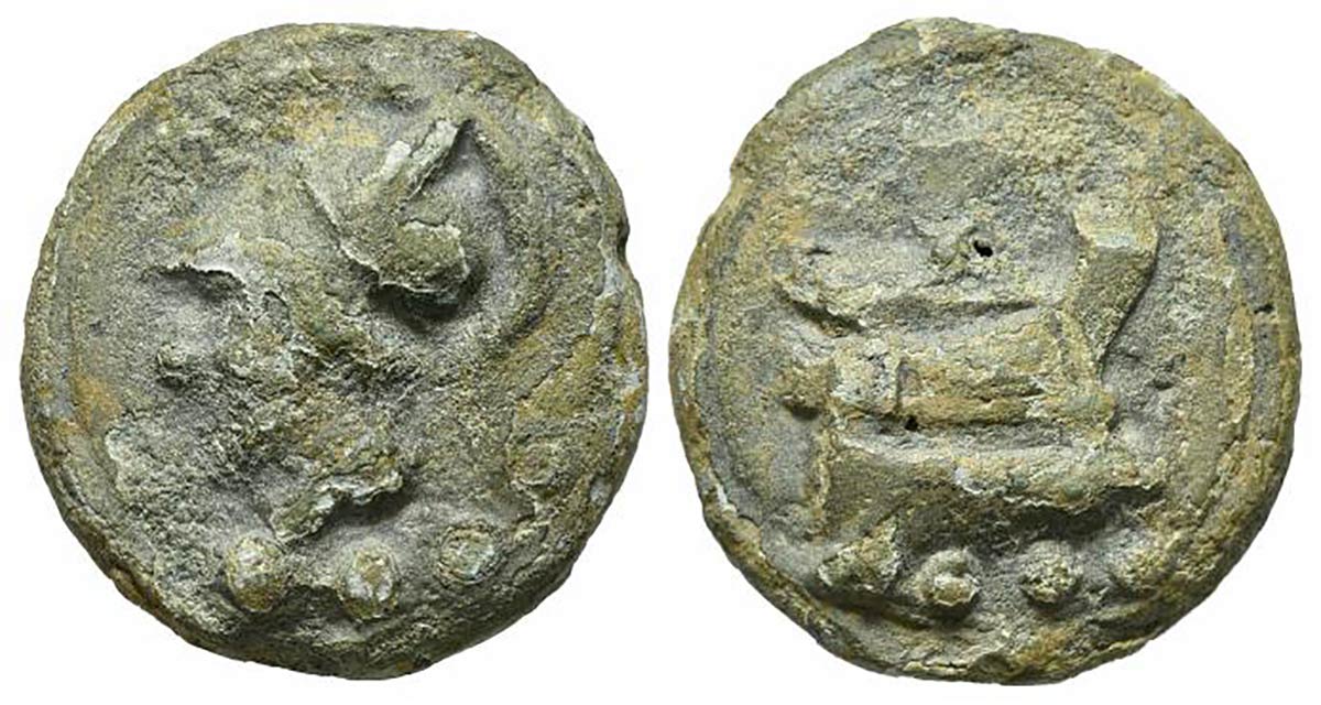 Anonymous, Rome, Cast Triens, ca. 225-217 BC. AE (g 97,42; mm 44; h 12). Helmeted head of Minerva or Mars l. on a raised disk; Rv. Prow of galley r. on a raised disk. Crawford 35/3a; Vecchi, ICC, 78; HNItaly 339; RBW 87. Good fine